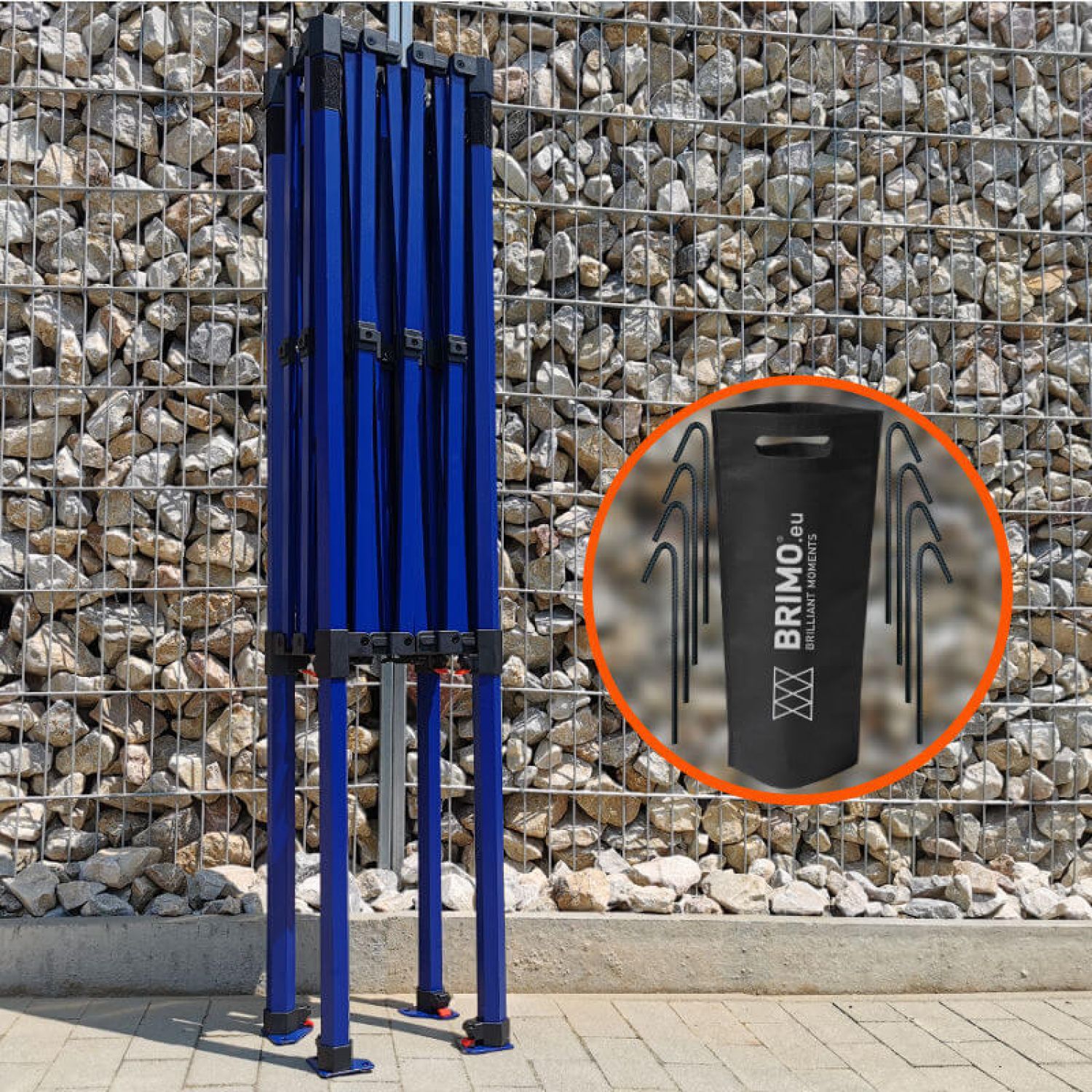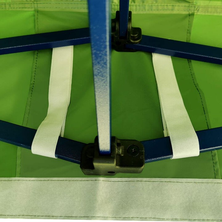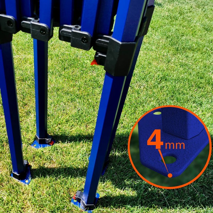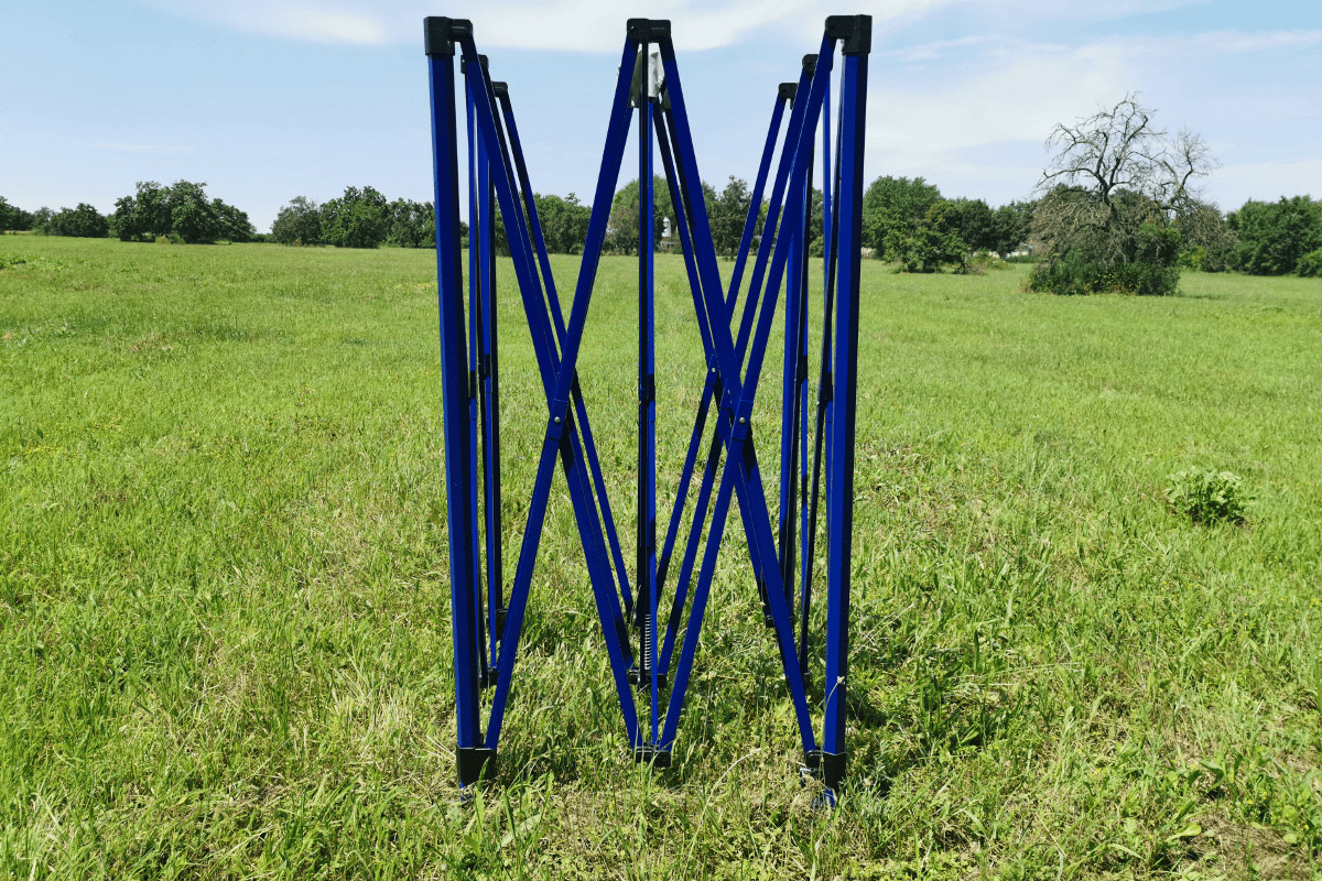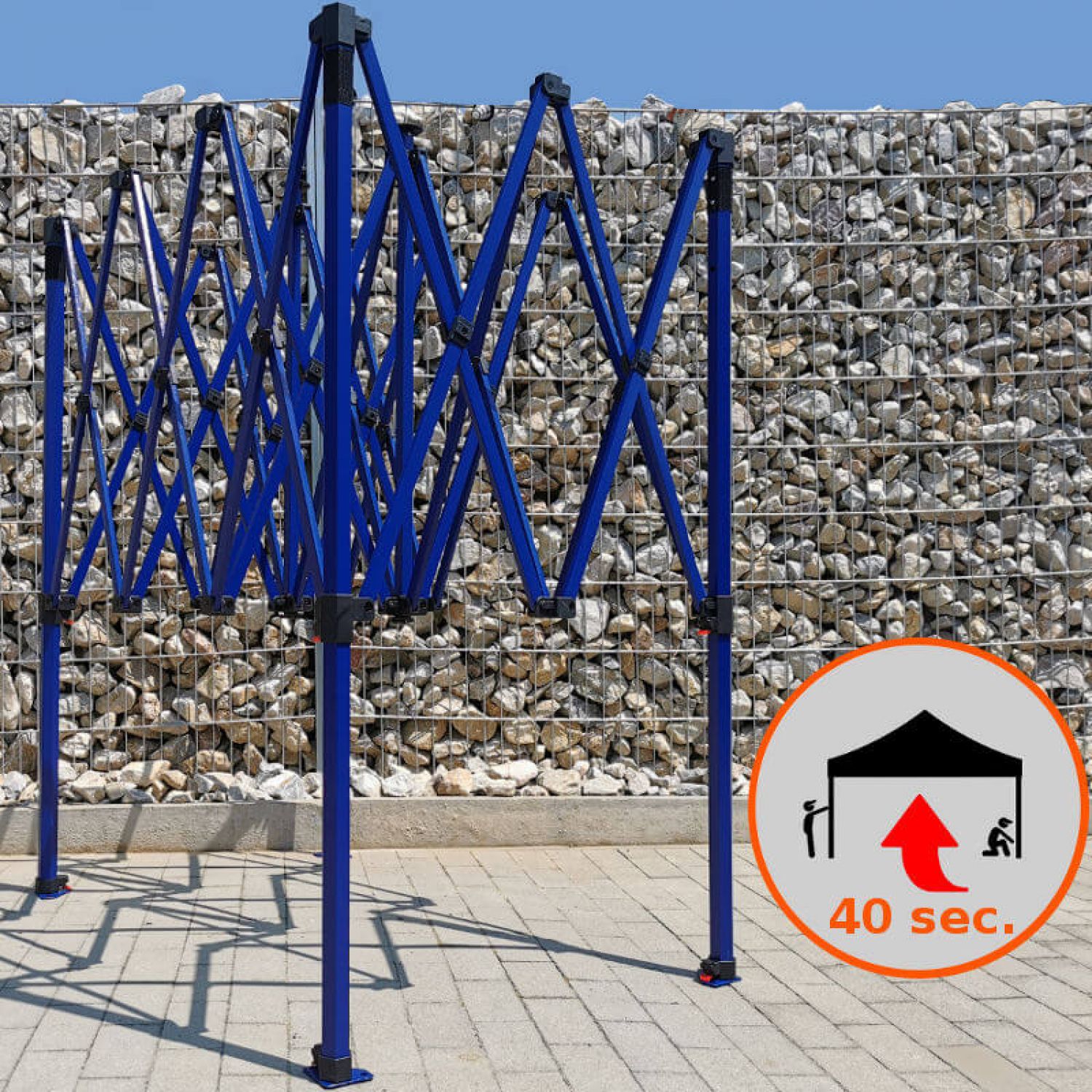 Rakenne varmistaa maksimaalisen vakauden myös intensiivisessä käytössä. Vankka runko kantaa turvallisesti tavarat, mainoskylteet tai kevyen valaistuksen. Katon täydellisen kiristyksen ja veden kertymisen eston takaavat saksimekanismi ja laadukas katos. Kattoprofiilit tarjoavat riittävän kantavuuden ja kestävyyden.